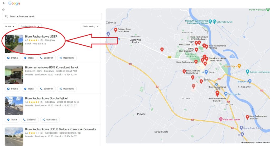 Wpisz w wyszukiwarce frazę ‘biuro rachunkowe’ + miasto, np. 'biuro rachunkowe Sanok’.